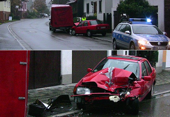 Auto rammte parkendes Gespann (Fotos: Hubert Richter)(hr) Hoher Sachschaden entstand heute Morgen bei einem Unfall auf der Heidelberger Straße in Schönbrunn-Haag.