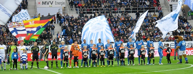 VfB Eberbach F- und E-Jugend laufen mit der TSG 1899 Hoffenheim ein (Foto: privat)(bro) (fm) Mit 125 VfB'lern startete man am Sonntag, 17. Oktober, nach Sinsheim. Bereits am frühen Mittag traf man sich im VfB-Sportheim zum gemeinsamen Weißwurstessen. Um 16 Uhr wurden die beiden Siegermannschaften des Mosca-Junior-Cups 2010 von den Betreuern der TSG Hoffenheim in Empfang genommen und in die Katakomben der Rhein-Neckar-Arena gebracht. Voller Spannung trafen die Teams kurz vor Anpfiff auf die beiden Mannschaften aus Gladbach und Hoffenheim. Hand in Hand mit den großen Idolen ging es danach auf das Spielfeld der Arena, um die über 30.000 Zuschauer zu begrüßen. Ein unvergesslicher Moment, der den Kindern noch lange in Erinnerung bleiben wird.
