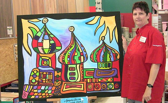 Mit Höchstgebot kranken Kindern helfen Sybille Lischke mit dem Versteigerungsobjekt. (Foto: Claudia Richter)(cr) Anfang Oktober veranstaltete der Hagebaumarkt Eberbach ein Kreativ-Event für Kinder und Erwachsene. Im Zuge dieser Veranstaltung entstand ein Kunstwerk, das jetzt für einen wohltätigen Zweck versteigert werden soll.