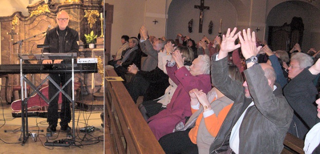 Aber Siegfried Fietz zog alle in seinen Bann. Er verbreitete mit seinen Liedern eine positive, lebensbejahende Botschaft, die den Anwesenden gut tat, was man auch in der Pause bei Getränken und Gebäck erfuhr. Auch auf Musikwünsche ging Fietz ein, und von Herzen sang man die Lieder mit. Als Bassist und Gitarrist begleitete ihn Gerhard Barth mit seinem virtuosen Spiel.