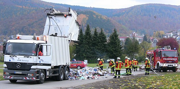 Heißer Stoff aus der Grünen Tonne (Foto: Hubert Richter)(hr) Abladen musste heute Vormittag der Fahrer eines Müllfahrzeugs seine Ladung in der Au. Der Wertstoff aus der "Grünen Tonne" war nämlich im Inneren des Lasters in Brand geraten.