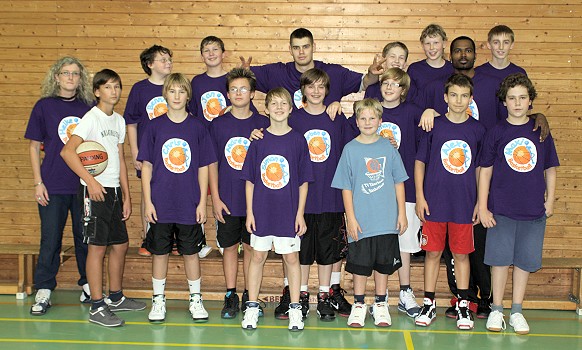 Nate Montgomery, mit 2,04 m einer der fünf Spieler beim USC, der die 2-Meter-Marke überschreitet, spielt seine erste Saison in Heidelberg, ebenso wie Leonard Mendez. Gleich zu Beginn bekamen die beiden ein Camp-T-Shirt überreicht, das sie auch bereitwillig anzogen. Und dann konnte es losgehen. Da die beiden US-Amerikaner nur wenige Wörter deutsch sprachen, bekamen die Eberbacher Kinder nicht nur eine zweistündige Trainingseinheit Basketball geboten, sondern auch eine in Englisch. Unter fachmännischer Leitung wärmten sich die Kinder mit klassischem Korblegeranlaufen auf, es folgten Ballhandlingübungen und ein Dribbelspiel.