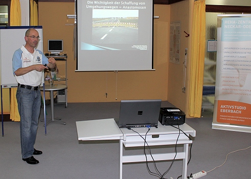 Physiotherapeut Thomas Sepp erklärte unter anderem den Aufbau des Lymphsystems anhand von Trans-Paint Darstellungen und die Folgen einer ärztlichen Krebstherapie auf das Lymphsystem. Weiterhin erläuterte Sepp die möglichen Folgen einer nicht durchgeführten Lymphdrainage bzw. komplexen physikalischen Entstauungstherapie im Bezug auf die Entstehung eines Lymphödems, das, wenn erst einmal entstanden, nicht mehr reversibel ist. Auch auf evtl. auftretende Komplikationen, wie unter anderem das Erysipel, die mit einem Lymphödem einhergehen können, ging Sepp genauer ein.