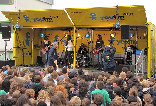 Für ihren Wettbewerbsauftritt hatten die Optimisten "Nobody's Wife" von der niederländischen Rocksängerin "Anouk" ausgewählt. Aufgewärmt wurde das Publikum aber mit dem Klassiker "Highway to Hell", der auch als Zugabe noch einmal zu hören war. Nach der Show wurden fleißig Autogramme an Schüler und Besucher verteilt.