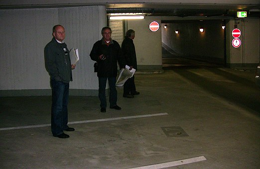 Markierungsarbeiten im Januar Rainer Menges (l.) und Klaus Muff vom Ordnungsamt bereiteten dieser Tage die Neueinteilung zusammen mit Manfred Schüßler (M.)vom Stadtbauamt vor. (Foto: Claudia Richter)(hr) Neu eingeteilt werden demnächst die Parkplätze in der Eberbacher Tiefgarage unter dem Leopoldsplatz.