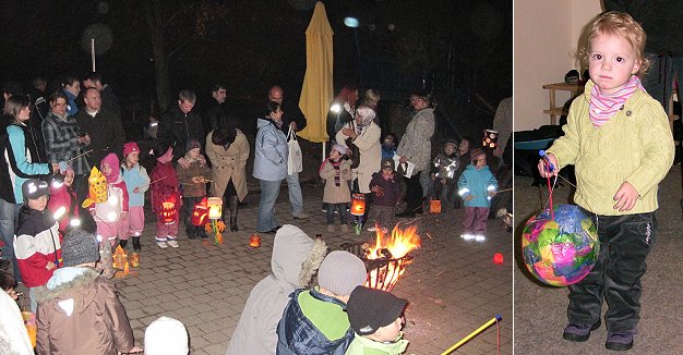 Nicht ganz so trocken und warm, aber dennoch urgemütlich war der Martinsumzug des Kindergartens "Arche Noah", der bereits am Dienstag, 9. November, stattfand. Gestartet wurde das Laternenfest am frühen Abend mit einem gemütlichen Beisammensein der Kinder und Erzieherinnen mit Geschichten und Liedern in den einzelnen Gruppen, gefolgt vom Laternenzug durch die nächtlichen Straßen rund um den Kindergarten. Anschließend wurde im Kindergartenhof stimmungsvoll rund um den flackernden Feuerkorb bei Martinsliedern, Kinderpunsch und Glühwein der gemütliche Ausklang gefeiert (Bild links). Dabei verzehrten Groß und Klein hungrig die traditionellen Martinshefemänner, die am Morgen vom Elternbeirat und vielen fleißigen Mamas im Kindergarten selbst gebacken worden waren.