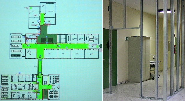 Im Ernstfall bleiben nur 30 Minuten - auch Steigeschule wird untersucht Die drei HSG-Bauten mit den grün eingezeichneten Fluchtwegen. Rechts die Errichtung einer Trennwand in einem der Flure. (Fotos: Hubert Richter / Claudia Richter)(hr) Vor knapp 14 Tagen - in den Herbstferien - rückten ím teilsanierten Hohenstaufen-Gymnasium (HSG) Arbeiter an und verwandelten die Schule erneut in eine Baustelle. Wie kurz darauf bekannt wurde, handelt es sich bei den Arbeiten um dringend notwendige Verbesserungen des Brandschutzes (wir berichteten). Warum die Maßnahmen jetzt so schnell durchgeführt werden und wie es um die Kosten steht, erläuterten Bürgermeister Bernhard Martin und Bauleiter Gerhart Grüber heute in einem Pressegespräch.