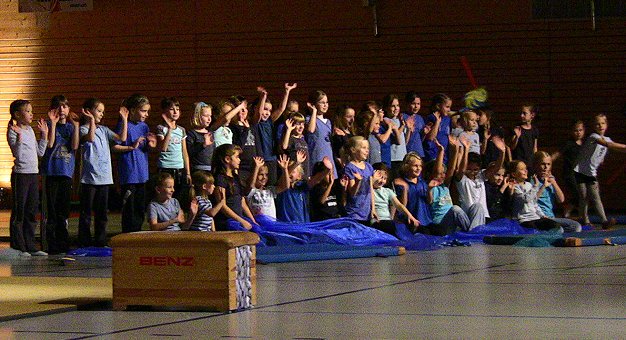 Als "Turnkinder aus aller Welt" machten die "Zwergen-", Kleindkinder- und die Eltern-Kind-Gruppen den Anfang. Nach dem Badminton-Nachwuchs und der ersten Jazztanzgruppe "Dancing Flames" stellten die Jungs und Mädchen des Allgemeinen Turnens die vier Elemente Feuer, Erde, Luft und Wasser turnerisch dar. Fernöstlich ging es bei den Judokas zu, die "Burning Waves" tanzten, und unter dem Motto "Turnus maskulinum est" zeigten die Turner der Fördergruppe, dass sie ihre Geräte wie Barren und Reck erheblich besser beherrschen als die lateinische Sprache.