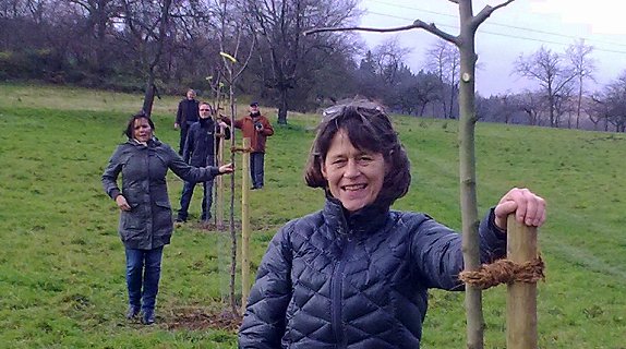EWG und Saftfirma sorgen für Streuobst-Nachwuchs (Foto: privat)(cr) Im Zuge des diesjährigen Apfeltages kündigte Dietrich Müller, der Vorsitzende der Eberbacher Werbegemeinschaft (EWG), dem Naturschutzbund Deutschland (NABU) Ortsgruppe Eberbach die Spende von sieben Obstbäumen an, die auf dem Breitenstein gepflanzt werden sollten. Spontan erklärte sich damals Michaela Falter von der Fruchtsaft-Firma Falter in Heddesbach bereit, die Anzahl der Pflanzen auf zehn aufzustocken.