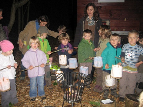 Die Holzscheiben werden schließlich zum Basteln von einzigartigen Laternen verwendet, die die Kinder stolz vorführen. Beleuchtet wurde die Vorführung mit den zuletzt selbst gefertigten Laternen der Waldkindergartenkinder aus Holzscheiben und selbst geschöpftem Papier.