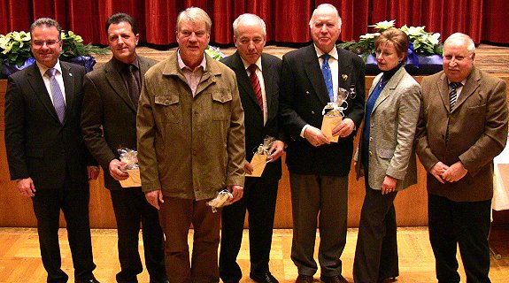 Zweistündiger Ehrungsmarathon in der Stadthalle Roland Weber (2.v.l.), Fritz Oeß (3.v.l.), Wolfgang Kleeberger (4.v.l.) und Wolfgang Brenneis (5.v.l.) wurden für langjähriges ehrenamtliches Engagement geehrt. (Foto: Hubert Richter)Mehr Bilder (Klicken zum Vergrößern):