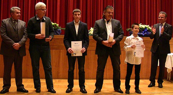 Zweistündiger Ehrungsmarathon in der Stadthalle Schnelle Motorsportler: Gerhard Münch (2.v.l.), Lukas Friedrich (3.v.l.), Gerd Beisel (4.v.l.) und Lukas Tulovic (5.v.l.). (Foto: Hubert Richter)Mehr Bilder (Klicken zum Vergrößern):
