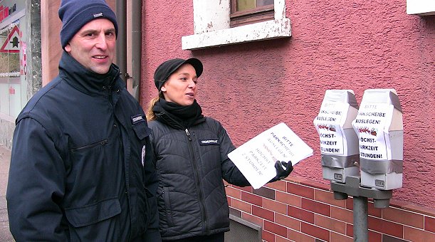 Im neuen Jahr werden Autofahrer wieder zur Kasse gebeten (Foto: Claudia Richter)(cr) In der Eberbacher Innenstadt darf wieder kostenlos geparkt werden. Alle Parkuhren wurden heute von Susan Bubnic und Peter Brand vom Ordnungsamt mit dem Vermerk versehen, dass das Parken umsonst ist (unser Bild). Von heute an sind die Parkuhren wegen Instandsetzungsarbeiten außer Betrieb. Allerdings ist die Parkdauer zeitlich begrenzt und die Parkscheibe muss gut sichtbar ins Auto gelegt werden. Bis einschließlich 2. Januar 2011 ist im Parkhaus und in der Innenstadt noch Gratis-Parken möglich, danach wird es ohne einen Parkschein oder "gefütterte" Parkuhr unter Umständen wieder teuer.