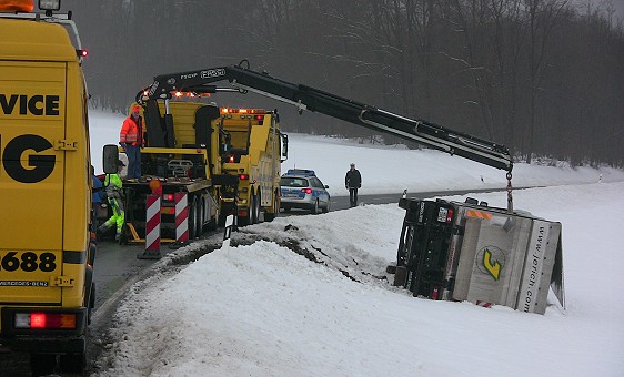 Der Fahrer eines Lastwagens war gegen 7.30 Uhr von Schwanheim in Richtung Schönbrunn unterwegs. Als ihm ein Räumfahrzeug entgegenkam, wich er leicht nach rechts aus und geriet dabei auf das talseitige Bankett. Der aufgeweichte Boden gab sofort nach, der Laster rutschte von der Straße und kippte um. Auf der darunter liegenden Wiese blieb der mit Papier beladene Lkw auf der Beifahrerseite liegen. Zur Bergung war ein Spezialunternehmen im Einsatz. Der Fahrer des Lastwagens aus dem Landkreis Wesel blieb unverletzt.