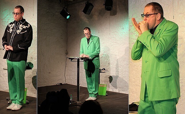 Angstfrei fürchten muss doch möglich sein Derselbe in grün. Thomas C. Breuer bei seinem dritten Besuch in Eberbach. (Fotos:Wörner)(tw) "Angst und Schrecken" verbreitete Thomas C. Breuer am Freitagabend in der Galerie Artgerecht. Auf Einladung des Kulturlabors Eberbach gastierte der Kabarettist und Autor dort vor vollem Haus mit seinem neuen Programm "Sohn der Angst".