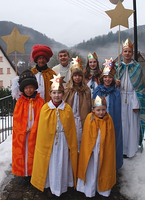 Auch in Friedrichsdorf sammelten Könige für La Concordia Die Sternsinger mit Pfarrer Matthias Stößer vor der Pfarrkirche in Friedrichsdorf.(Foto:privat)(tw) In Friedrichsdorf machten sich vergangenen Sonntag nach dem Gottesdienst acht Kinder und Jugendliche auf den Weg, um als drei Könige von Haus zu Haus zu ziehen. Sie sangen ihre Lieder, sagten einen Segenstext auf und schrieben den Segen an die Haustüren. Die Friedrichsdorfer spendeten wie in den vergangenen Jahren großzügig und so kamen über tausend Euro für die Partnergemeinde in La Concordia in Ecuador zusammen. Die Leiterin der Sternsingeraktion in Friedrichsdorf Christina Münch bedankte sich bei den fleißigen Sternsingern und den freundlichen Spendern.