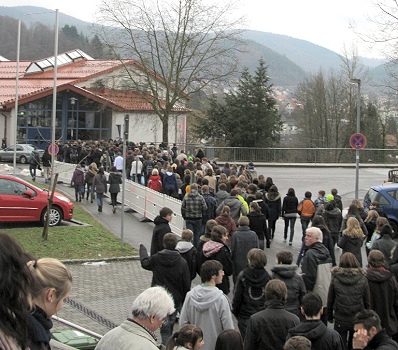 Erste Evakuierungsübung nach neuem Flucht- und Rettungskonzept (Foto: Peter Krauch)(pck) Nach den kostenintensiven Nachrüstungen beim Brandschutz am Hohenstaufen-Gymnasium in den vergangenen Wochen (wir berichteten) fand heute die erste Evakuierungsübung nach neuem Flucht- und Rettungskonzept statt.