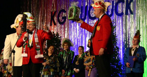 Zahlreiche Ehrengäste konnte KGK-Präsident Udo Geilsdörfer begrüßen, darunter die Bundestagsabgeordneten Dr. Stephan Harbarth (CDU) und Lothar Binding (SPD) sowie die Landtagsabgeordneten Peter Hauk und Elke Brunnemer (beide CDU). Zu den Gratulanten zählte auch Deutschlands oberster Karnevalist, der Präsident des Bundes Deutscher Karneval (BDK), Volker Wagner (Bild unten links mit Udo Geilsdörfer). KGK-Vizepräsident Markus Scheurich präsentierte das Jubiläumsprinzenpaar Luisa I. (Luisa Menges) und Benni I. (Benjamin Müller), die ihrerseits die Jubiläumsgäste begrüßten mit dem Motto: "Die KG Kuckuck ist für Eberbach so wichtig wie für's Haus das Dach".