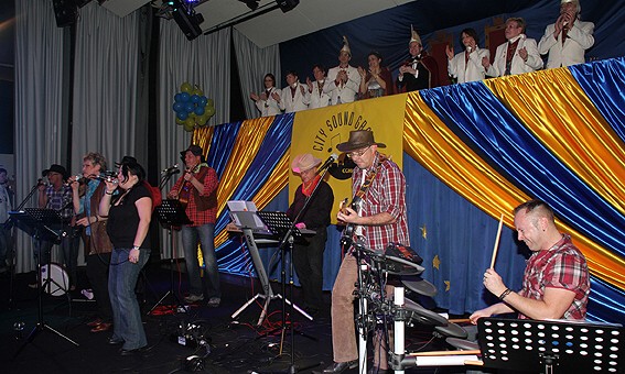 Zur Programmhalbzeit waren die 2 x 22 Minuten Pause willkommener Anlass zum Erfrischen, Stärken und Runterkühlen. Die Rückkehr in den Saal wurde durch die heißen Klänge der „City Sound Group“ erleichtert. Es gab Lieder zum Schunkeln und Mitsingen, die Stimmung im Saal begann wieder zu kochen, das Publikum war schnell wieder auf Betriebstemperatur. Quasi nahtlos ging es zum zweiten Teil über, wieder ein Fest für Augen und Ohren, und dann endlich wurde das Geheimnis um das neue Prinzenpaar gelüftet.