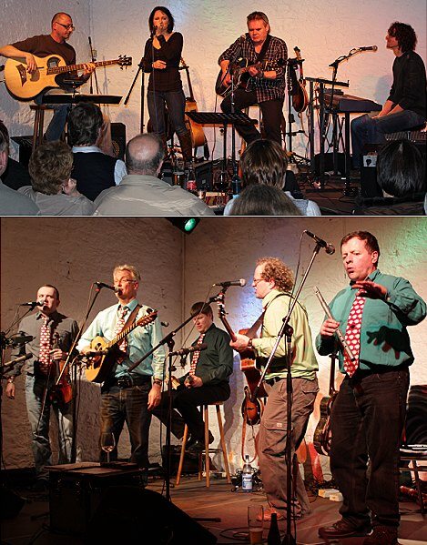Zu ihrem Auftritt in Eberbach hatten die "Matching Ties" (zusammenpassende Krawatten), die bei ihren Konzerten stets Krawatten mit dem gleichen Motiv tragen, überraschend einen Gast mitgebracht. Konrad Stock aus München, der gelegentlich mit den "Ties" auftritt unterstützte diese mit der Bodhran (irische Trommel) an verschiedenen Whistles (Flöten) und mit dem Dudelsack. Paul Stowe ist der witzige amerikanische Gitarrist und Sänger, der mit dem ganz von englischem Humor beseelten Briten Trevor Morriss (Mandoline, irische Bouzouki, Gitarre, Gesang) schon seit 25 Jahren zusammen spielt. Georg Bähr aus Berlin lebt in Aschaffenburg und ist der virtuose Geiger der Truppe, spielt aber auch Mandoline und singt mit bei einigen Titeln mit Stowe und Trevor zusammen dreistimmig. Schließlich der Ire Colm O’Tuama, der mit Inbrunst und Hingabe irische Flöte, Tin- und Low Whistles spielt und bei einigen Songs die vierte Stimme gibt. Wie Paul Stowe erklärte, haben sie sich in letzter Zeit mehr auf Irish Folk konzentriert. Am Freitag spielten "Matching Ties" unter anderem ein Medley in diesem Genre, begleitet von Trevor Morriss auf der irischen Bouzouki. Sie erzählten die Geschichte vom weißen Petticoat. Aber auch Trinklieder wie der Song von "Jack Stewart" gaben die fünf zum Besten und mit "Goldrush" typischen Bluegrass. Für weitere Abwechslung sorgten sie mit Blues, Balladen und Country. Konrad Stock hatte einen Dudelsack mitgebracht, der ebenfalls noch zum Einsatz kam, und Colm O´Tuama gab in seinem irischen Gälisch eine Kostprobe in "Lilting" einem rhythmischen Sprechgesang.