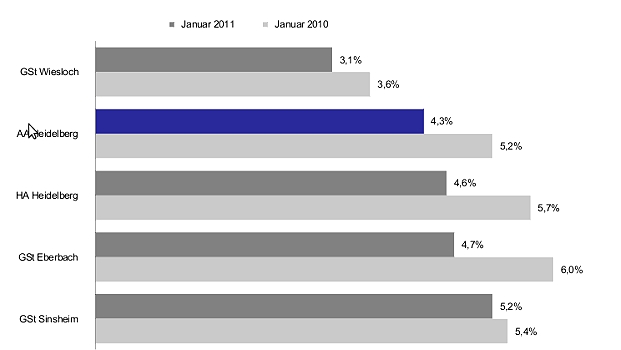 Jahreszeitliche Einflüsse prägen das Geschehen Arbeitslosenquoten im Januar 2011. (Grafik: Bundesagentur für Arbeit)(bro) (aa) Ende Januar waren im Bezirk der Agentur für Arbeit Heidelberg 9.414 Personen arbeitslos gemeldet - 671 mehr als im Dezember, jedoch 1.907 weniger als im Januar 2010. Die Arbeitslosenquote im Gesamtbezirk beträgt jetzt 4,3 Prozent. Dieser Wert ist damit um 0,3 höher als im Dezember und um 0,9 Prozentpunkte niedriger als der Vorjahreswert.