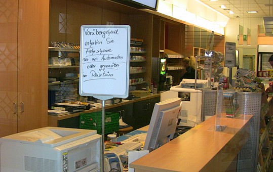 Fahrkartenproblem am Bahnhof soll kein Dauerzustand werden (Foto: Bastian Richter)(pck) Seit Freitag gibt es im DB Service Store am Eberbacher Bahnhof keinen Fahrkartenverkauf mehr. Die Kunden werden an die vorhandenen Automaten oder das TUI-Reisecenter verwiesen.
