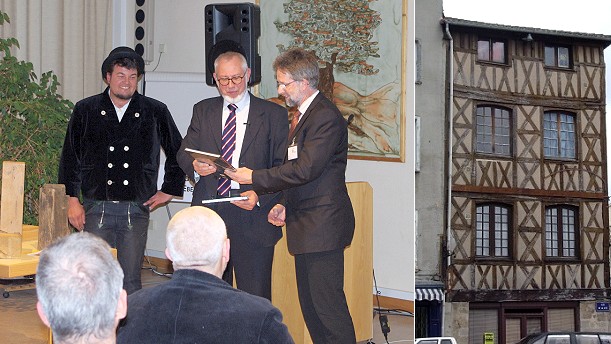 Fachwerkbau - Chancen für das Handwerk Links: Prof. Gerner mit Schulleiter Staniczek (re.) und dem Lehrer Fabian Fahr (li.). Rechts: Ein Fachwerkhaus mit einer Vielzahl von Andreaskreuzen. (Fotos: privat)(bro) (rod) Am Donnerstag, 10. Februar, hielt Professor Manfred Gerner, ein ausgewiesener Experte in Sachen Fachwerk, Holzkonstruktionen und Bausanierung, sowie selbst gelernter Zimmermann, in der Aula der Theodor-Frey-Schule seinen Vortrag zu dem Thema „Fachwerkbau - Chancen für das Handwerk“.