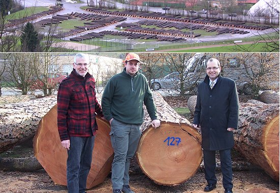 Spitzenpreise über 1.000 Euro pro Festmeter Fred Wittmann (r.) und Walter Schlenker (l.) von der Pfälzer Katholischen Kirchenschaffnei mit Förster German Lippert bei der Besichtigung der wertvollen Lärchenstämme aus dem Wald der Kirchenschaffnei. (Fotos: Hubert Richter / LRA)