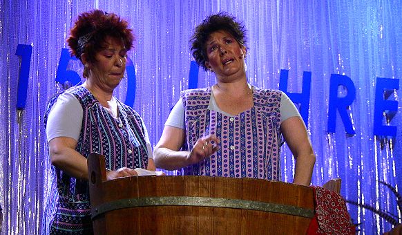 Jubiläumsprogramm mit Narretei und Tanz - Abschied von Kultfiguren Knorrisch und Storrisch Die Waschfrauen Regina Becker und Martina Wäsch (v.l.). (Foto: Hubert Richter)Mehr Bilder (Klicken zum Vergrößern):