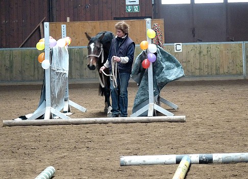 An vier Samstagen stellten sich neun Teilnehmer einem Parcours mit allem, was Pferde im Straßen- oder Turnieralltag fordert: Mülleimer, bunte Luftballons, Regenschirme, Plastikplanen und weitere Gefahrenquellen aus Pferdesicht. Dabei ging es aber nicht nur um das Überwinden von Ängsten, sondern auch darum, wie man sein Pferd richtig führt. Es wurde erlernt, wie man ein ausbrechendes Pferd korrigiert, lenkt oder auch nur beruhigt. Gehorsam und Gelassenheit liegen hier dicht beieinander.
