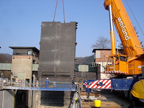 Rechte Schleusenkammer erhält neue Tore (Foto: privat)(bro) (jh) Am 22. Februar wurden die vier neuen Torflügel der rechten Kammer mittels großer Autokräne in die Schleusenkammer gehoben. Auf dieses Ereignis haben die Experten des Wasser- und Schifffahrtsamtes Heidelberg, des Amtes für Neckarausbau Heidelberg und der ausführenden Baufirmen seit einem Jahr hingearbeitet.