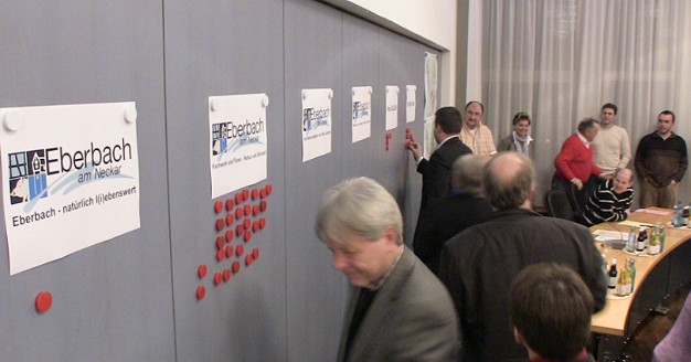 Der heute gewählte Slogan war im Wettbewerb an zweiter Stelle gelandet. Dr. Harald Grote (AGL) hatte heute zunächst beantragt, die Abstimmung zu vertagen, da die vorliegenden Vorschläge noch unbefriedigend seien. Gerade der von der Projektgruppe vorgeschlagene Slogan erwecke den Eindruck, bei Eberbach handele es sich um ein "verschlafenes Städtchen hinten am Wald". Grote vermisse in dem Vorschlag die Aspekte Kultur und Zukunftsorientierung.. Die Vertagung wurde aber mehrheitlich abgelehnt. Abgestimmt wurde schließlich mit Magneten, die die Ratsmitglieder an die Vorschläge heften konnten, wobei jeder drei Stimmen hatte. "Fachwerk und Fluss - Natur und Genuss" erhielt 33 Magnete. 17 "Stimmen" gab es für die Variante "Kein Slogan" und 18 Magnete wurden unter die Option "Enthaltung" geheftet. Lediglich einen Magneten gab es für den Wettbewerbssieger "Eberbach - einfach l(i)ebenswert".