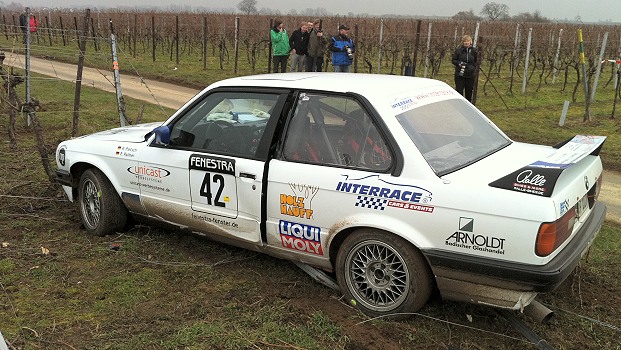 Bei der vierten Wertungsprüfung sind Ralf Pietsch und Peter Palmer aufgrund eines Unfalls ausgeschieden. Auf schlammiger Fahrbahn ist das Fahrzeug beim Beschleunigen aus einer Rechtskurve mit dem rechten Hinterrad auf die Grasnarbe geraten und wurde nach links in die Weinäcker geschleudert. Das Fahrzeug steckte fest und war somit nicht mehr fahrbereit.
