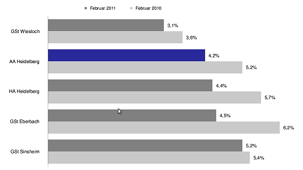 (bro) (aa) Ende Februar waren im Bezirk der Agentur für Arbeit Heidelberg 9.188 Menschen arbeitslos gemeldet - 226 weniger als im Januar und damit 2.097 weniger als im Februar 2010. Die Arbeitslosenquote im Gesamtbezirk beträgt jetzt 4,2 Prozent. Dieser Wert ist damit um 0,1 niedriger als im Januar und um einen Prozent niedriger als vor einem Jahr.