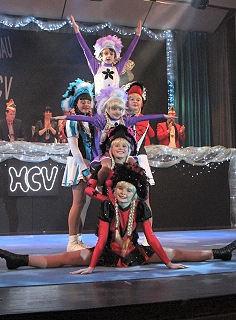 Danach zogen Claudia Debo und Hannelore Berger am“ Worschtstand“ das Ortsgeschehen durch den Kakao, vermischt mit jeder Menge schrägen Kommentaren zum Verhältnis zwischen Mann und Frau und Alltagsgeschichten. Die Dance Academy glänzte mit einer bunten und ständig wechselnden Kostümschau auf einer Reise von Bayern über Las Vegas und New York nach Florida.