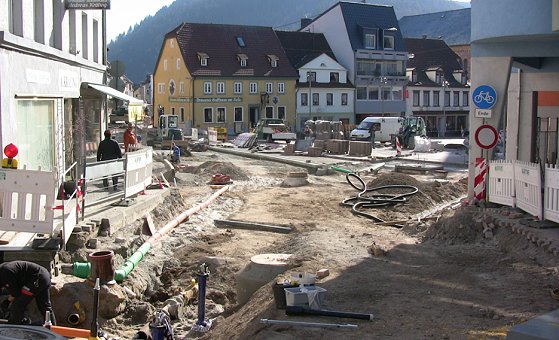 Baustelle bringt Narren auf neue Wege (Foto: Hubert Richter)(hr) Aufgrund der Bauarbeiten in der Odenwaldstraße im Bereich Neuer Markt (unser Bild) und der damit verbundenen Straßensperrung muss in diesem Jahr der Streckenverlauf für den Eberbacher Fastnachtsumzug am kommenden Dienstag geändert werden.