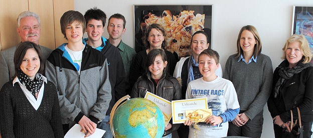 Siebtklässler Maximilian Schöner gewann Erdkundewettbewerb Die HSG-Schulsieger des Erdkundewettbewerbs wurden im Beisein der beteiligten Lehrer und von Oberstudiendirektor Helmut Schultz geehrt. V. r.: Oberstudienrätin Elisabeth Schnädelbach-Bödeker, Studienrätin Jutta Hertlein, Maximilian Schöner (7. Klasse), Studienrätin Alexandra Meng-Emmerich, Kira Robens (7. Klasse), Studienrätin Susanne Pfisterer, Studienrat Oliver Teikemeier, Yannik Wörtz (10. Klasse), Lasse Schulz (10. Klasse), Oberstudiendirektor Helmut Schulz und Studienrätin Julia Naßutt. (Foto: privat)