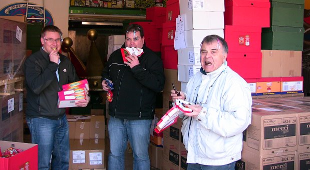 KGK-Projektsteuerer koordiniert Wurfmaterial Markus Scheurich, Udo Geilsdörfer und Helmut Deschner (v.l.) beim Testen der Naschereien. (Foto: Claudia Richter)(cr) Trotz der zahlreichen Baustellen und Straßensperrungen der letzten Wochen in Eberbach ist es auch in diesem Jahr der Karnevalgesellschaft Kuckuck (KGK) gelungen, gleich tonnenweise Bonbons und weitere Wurfmaterialen für die Faschingsumzüge im Vereinsheim "Kuckucksnest" einzulagern.