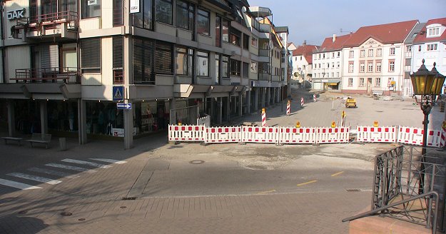 Erneute Belastung für Einzelhändler Im Übergangsbereich von der Bahnhofstraße zum Neuen Markt (im Vordergrund) soll demnächst gearbeitet werden. (Foto: Hubert Richter)(aum) Wer gedacht hatte, dass sich der innerstädtische Verkehr mit der Fertigstellung des Neuen Marktes und der Odenwaldstraße wieder normalisieren würde, wurde gestern bei der Bürgerinformation im Sanierungsgebiet eines Besseren belehrt: Ab Ende März soll die Bahnhofstraße für vier Wochen gesperrt werden.