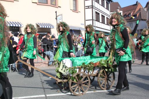 Hirschhorn lag am Nachmittag fest in der Hand der Narren. Ein bunter, stimmungsgeladener Gaudiwurm erstreckte sich mit 98 Gruppen vom Höhenweg - Ersheimer Straße über die Schleusenbrücke durch die Hauptstraße, über den Freien Platz, die Hainbrunner Straße, Hammergasse, Langenthaler Straße und Grabengasse. Auflösung fand der Zug wieder am Freien Platz. Dort moderierten Doris Heckmann und Hans-Jürgen Waibel das Geschehen, wie immer mit viel Humor vom Balkon des Rathauses.