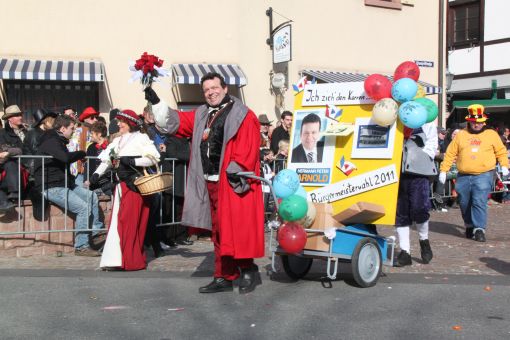 Hirschhorn lag am Nachmittag fest in der Hand der Narren. Ein bunter, stimmungsgeladener Gaudiwurm erstreckte sich mit 98 Gruppen vom Höhenweg - Ersheimer Straße über die Schleusenbrücke durch die Hauptstraße, über den Freien Platz, die Hainbrunner Straße, Hammergasse, Langenthaler Straße und Grabengasse. Auflösung fand der Zug wieder am Freien Platz. Dort moderierten Doris Heckmann und Hans-Jürgen Waibel das Geschehen, wie immer mit viel Humor vom Balkon des Rathauses.