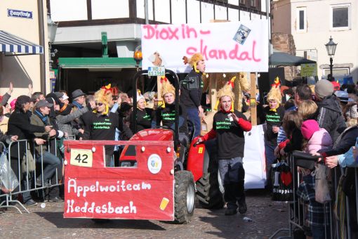 Hirschhorn lag am Nachmittag fest in der Hand der Narren. Ein bunter, stimmungsgeladener Gaudiwurm erstreckte sich mit 98 Gruppen vom Höhenweg - Ersheimer Straße über die Schleusenbrücke durch die Hauptstraße, über den Freien Platz, die Hainbrunner Straße, Hammergasse, Langenthaler Straße und Grabengasse. Auflösung fand der Zug wieder am Freien Platz. Dort moderierten Doris Heckmann und Hans-Jürgen Waibel das Geschehen, wie immer mit viel Humor vom Balkon des Rathauses.