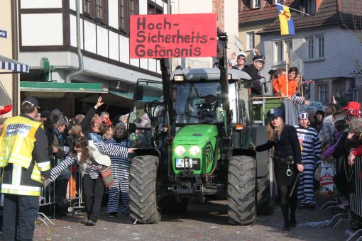 Hirschhorn lag am Nachmittag fest in der Hand der Narren. Ein bunter, stimmungsgeladener Gaudiwurm erstreckte sich mit 98 Gruppen vom Höhenweg - Ersheimer Straße über die Schleusenbrücke durch die Hauptstraße, über den Freien Platz, die Hainbrunner Straße, Hammergasse, Langenthaler Straße und Grabengasse. Auflösung fand der Zug wieder am Freien Platz. Dort moderierten Doris Heckmann und Hans-Jürgen Waibel das Geschehen, wie immer mit viel Humor vom Balkon des Rathauses.