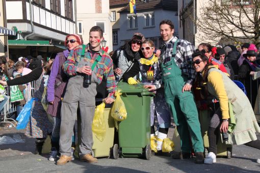 Hirschhorn lag am Nachmittag fest in der Hand der Narren. Ein bunter, stimmungsgeladener Gaudiwurm erstreckte sich mit 98 Gruppen vom Höhenweg - Ersheimer Straße über die Schleusenbrücke durch die Hauptstraße, über den Freien Platz, die Hainbrunner Straße, Hammergasse, Langenthaler Straße und Grabengasse. Auflösung fand der Zug wieder am Freien Platz. Dort moderierten Doris Heckmann und Hans-Jürgen Waibel das Geschehen, wie immer mit viel Humor vom Balkon des Rathauses.