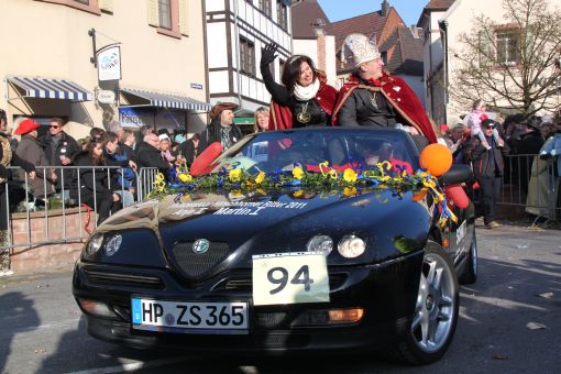 Hirschhorn lag am Nachmittag fest in der Hand der Narren. Ein bunter, stimmungsgeladener Gaudiwurm erstreckte sich mit 98 Gruppen vom Höhenweg - Ersheimer Straße über die Schleusenbrücke durch die Hauptstraße, über den Freien Platz, die Hainbrunner Straße, Hammergasse, Langenthaler Straße und Grabengasse. Auflösung fand der Zug wieder am Freien Platz. Dort moderierten Doris Heckmann und Hans-Jürgen Waibel das Geschehen, wie immer mit viel Humor vom Balkon des Rathauses.