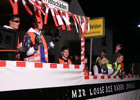 Nach der Aufstellung am südlichen Ortseingang von Unter-Sensbach unter der bewährten organisatorischen Leitung von Zugmarschall Florian Haas setzten sich nach 18.30 Uhr insgesamt 28 Fußgruppen, Motivwagen und Musikkapellen in Bewegung. Viele Teilnehmer kamen aus Sensbachtal selbst, wo die Fastnacht gemeinsam von den Vereinen TSV und MGV organisiert wird, die gestern Abend im Gemeindezentrum zu einem bunten Abend eingeladen hatten. Gruppen aus Reisenbach (Turmwächter), Beerfelden, Waldbrunn, Mossautal, Hetzbach und Vielbrunn bereicherten den Sensbachtaler Gaudiwurm ebenso wie eine Fußgruppe der Eberbacher KG Kuckuck, die als Waldgeister ins "Tal der Liebe" gekommen war. Altbürgermeister Manfred Heiss stellte am Mikrofon die einzelnen Gruppen vor.