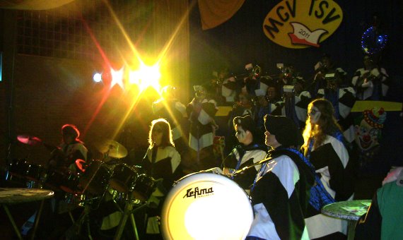 Lauter und bunter Gaudiwurm zum Gemeindezentrum Im Saal des Gemeindezentrums spielte anschließend die Guggemusik aus Aglasterhausen. (Foto: Hubert Richter)Mehr Bilder (Klicken zum Vergrößern):