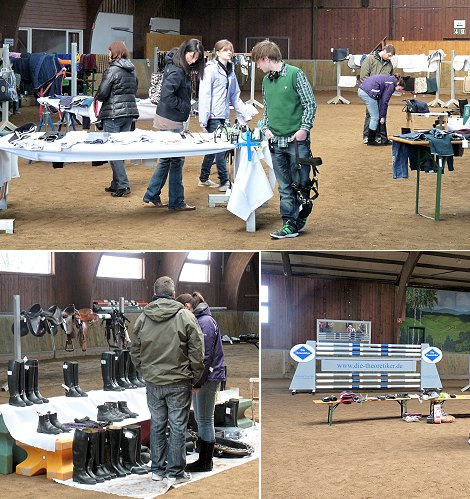Second-Hand-Basar in der Beerfeldener Reithalle (Fotos: privat)(bro) (rau) Am Sonntag glich die Reithalle in Beerfelden wieder einmal einem gut sortierten Sportgeschäft für Reiterbedarf. Der Second-Hand-Basar wurde vom RFVO veranstaltet und kam beim Publikum bestens an. Ob Sättel, Trensen, Stiefel oder Schabracken, alles war in reicher Auswahl im Angebot. Ständer und Stangen, die ansonsten zum Aufbau von Sprüngen benötigt werden, dienten nun der Warenpräsentation. Dabei bekam der von der Event-Management-Gruppe „Die Theoretiker“ gestiftete nagelneue Sprung einen Ehrenplatz und konnte vor dem großen Wandspiegel bewundert werden. Zahlreiche ehrenamtliche Helferinnen und Helfer aus den Reihen des Reit- und Fahrvereins sorgten für einen reibungsfreien Ablauf - vom Reinigen der Halle bis zur korrekten Abrechnung aller Verkäufe.