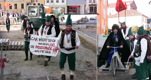 Sie wollten nicht glauben, dass der morgen stattfindende Fastnachtsumzug nicht über den Neuen Markt führen wird. Zu Fuß sei es kein Problem die baulichen Hindernisse zu überwinden, so die einhellige Meinung. Auch für den Zwergenexpress, auf dem immerhin sieben Zwerge Platz finden können, sei ein Durchkommen ohne Schwierigkeiten machbar. Handwerklich begabte Zwerge gingen mit Meterstab bewaffnet an die Sache heran uns stellten fest: "In der Höhe haben wir den meisten Platz, die Länge reicht, nur mit der Tiefe wird es eng". Einwandfrei wäre die Durchfahrt auch für weitere Ökomobile, ist sich die zwergische Rasselbande einig. "Wir laufen aber am morgigen Fastnachtsdienstag aus Solidarität den neuen Umzugsweg mit" versicherte der heutige Sprecher der Rasselbande Friedrich Seibert im Namen aller Zwerge.