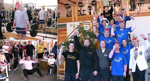Nachdem die politische Arbeit fürs erste erledigt war, verlegten die Fastnachter ihr Aufgabengebiet in das Fitnessstudio Palestra in der Au. Im Zuge des 150jährigen Jubiläums der Kuckucke hatte das Prinzenpaar auf der ersten Prunksitzung des Vereins die Eberbacher zu mehr Fitness aufgefordert. Heute wurde von dem Palestra-Team ein spezielles Sportprogramm vorgestellt. Bei einem Faschingsteam-Wettbewerb war Ausdauer, Kraft, Schnelligkeit und Koordination gefragt. Als Lockerungsübungen konnte man hingegen fast das von KGK-Regisseurin Barbara Menges ausgearbeitete Programm bezeichnen. Hier war vor allem Mut zum Singen und Humor gefragt. Die närrischen Sportlerinnen und Sportler bekämpften oft schweißgebadet und teilweise atmemlos ihren inneren Schweinehund, verzichteten beinahe ganz auf Doping und Drogen, und gaben ihr Bestes beim Gewichtheben oder Bauchmuskeltraining. Überraschend gut schlugen sich auch die Mitarbeiter und Mitarbeiterinnen der Stadtverwaltung. Beispielsweise machte Hauptamtsleiter Arndt Zimmermann - adrett gekleidet mit züchtiger Unterhose - bei einer geforderten Lewwerworschdliedperformance eine gute Figur, der urlaubsgebräunte Personalchef Edgar Hass und der Leiter der Stadtwerke Stefan Schwarz wirkten absolut fit in ihrem coolen Jeans-Outfit, und auch Deborah Dietz von der Stadtverwaltung zeigte sich als Unterstützerin der Atkion kämpferisch in passendem Latzhosen-Sportdress. Dietz musste heute kurzerhand für die Herren des Bauamtes einspringen, da diese an der traditionellen Rosenmontagsaktion der KG Kuckuck aus diversen terminlichen Gründen nicht teilnahmen. Sportlich elegant sahen außerdem allesamt die Aktiven der KGK aus. Unter Anleitung und den strengen Blicken der Palestra-Geschäftsführer Gregor Haslberger und Stefan Speth wurden nach dem mehrstündigen Wettkampf, bei dem insgesamt elf Disziplinen zu meistern waren, die Sieger ermittelt. Die Gewinnergruppe mit Präsident Udo Geilsdörfer kam auf den ersten Platz und erhielt T-Shirts. Die Teilnehmer, die heute nicht mit wertvollen Preisen nach Hause gehen konnten, werden wahrscheinlich spätestens morgen von ihrem Muskelkater daran erinnert, dass die vom Prinzenpaar getroffene Auswahl des Fitnessprogramms optimal zum Erhalt der Jugendlichkeit beim über 150-jährigen Karnevalverein ist.
